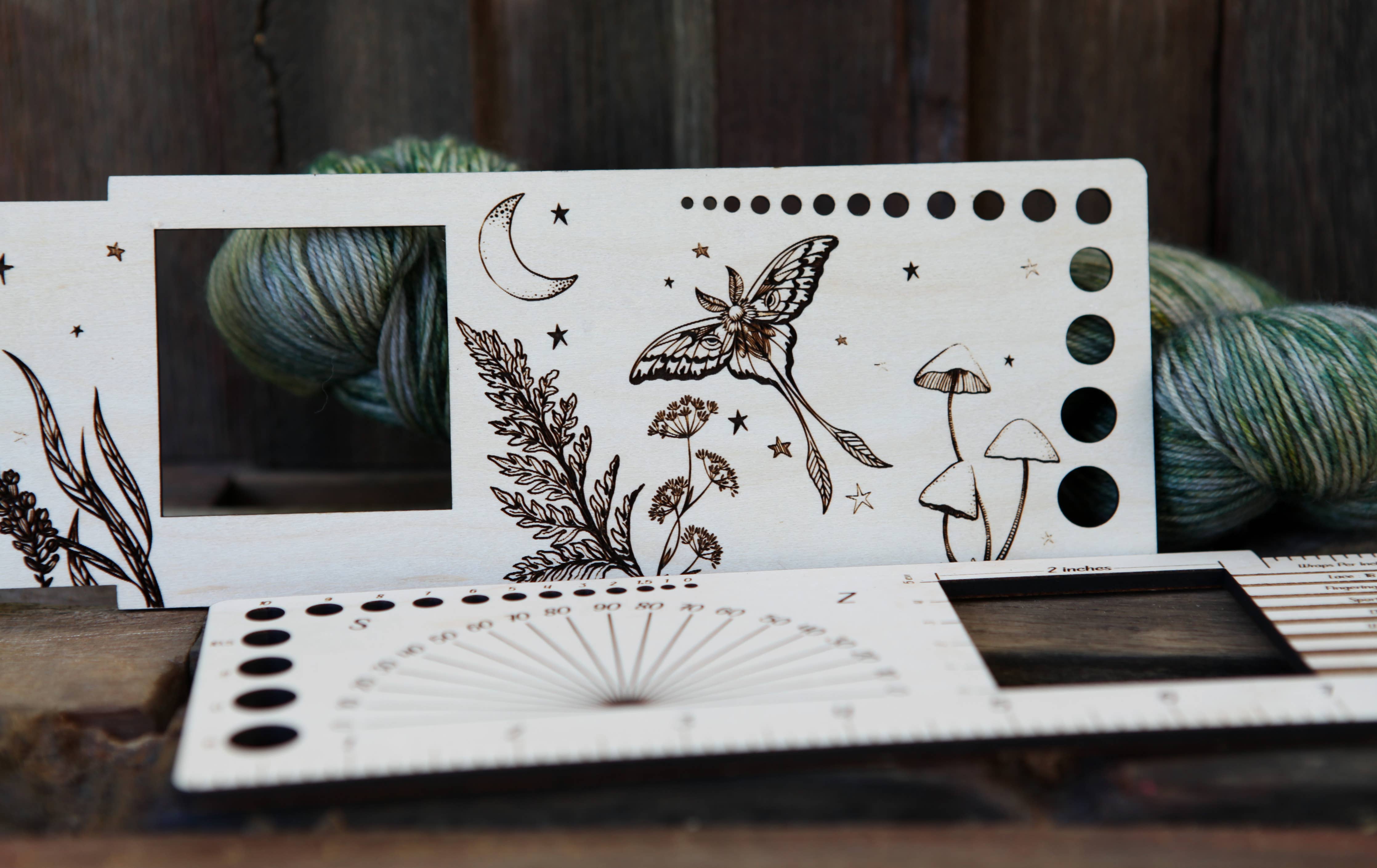 One tool, endless uses. The Luna Moth “Almost Everything” Ruler is etched with a night sky design—crescent moon, stars, forest plants, and a luna moth in flight—and doubles as one of the most versatile fiber-arts tools you’ll own.