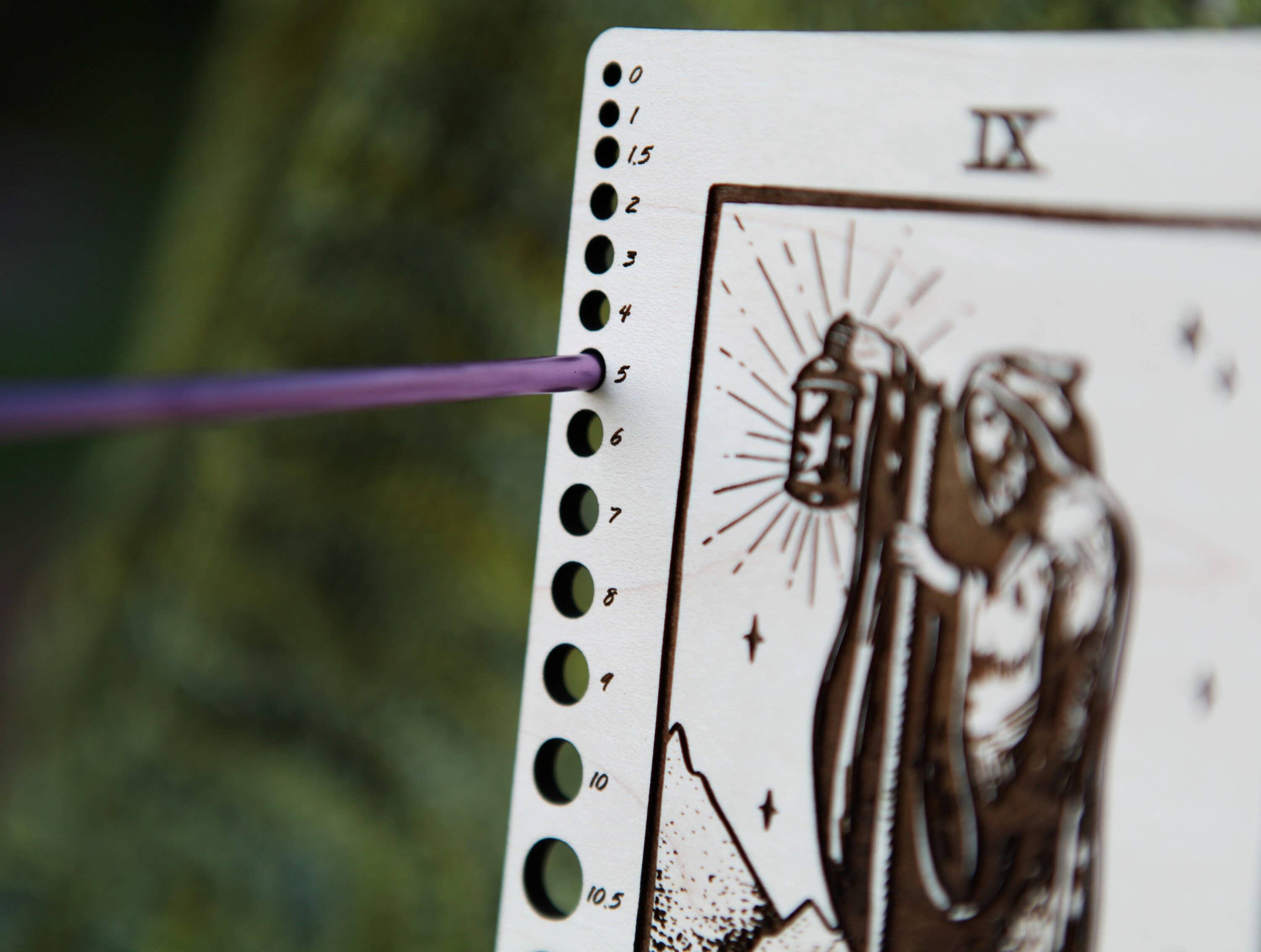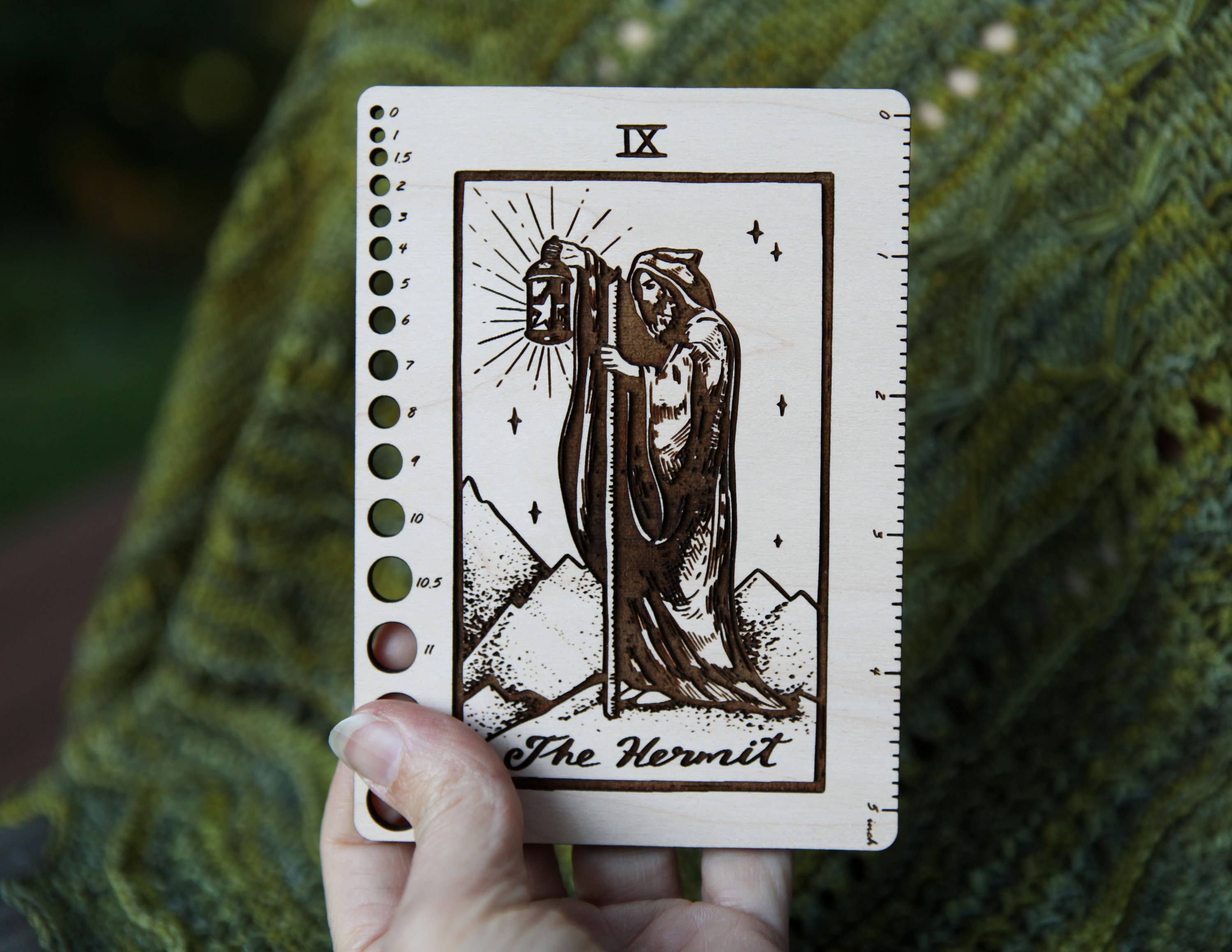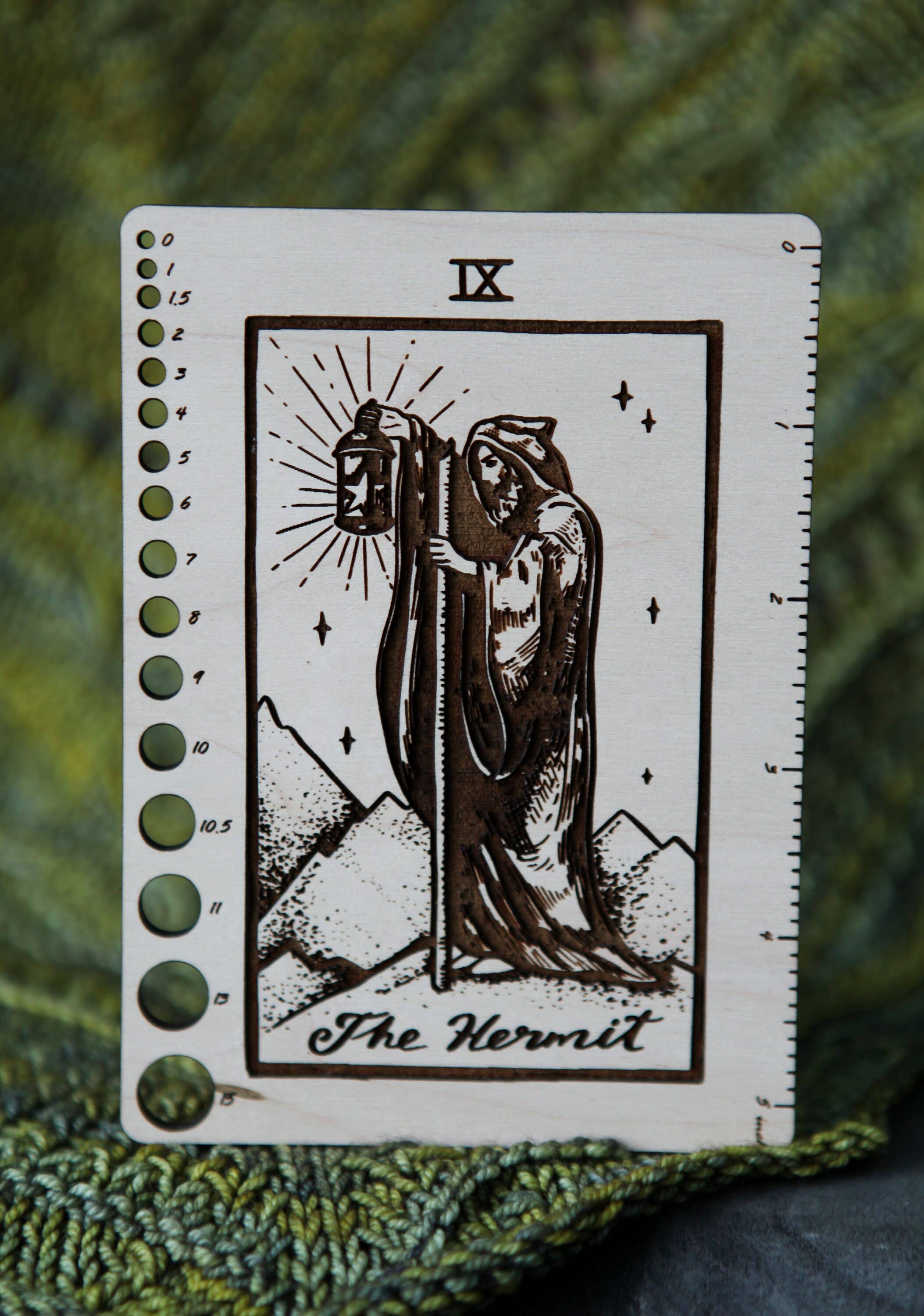 Find quiet focus in your craft with this Tarot-inspired needle gauge and ruler. Made from maple wood, this rectangular tool features The Hermit from the Major Arcana—symbol of introspection, solitude, and inner wisdom.