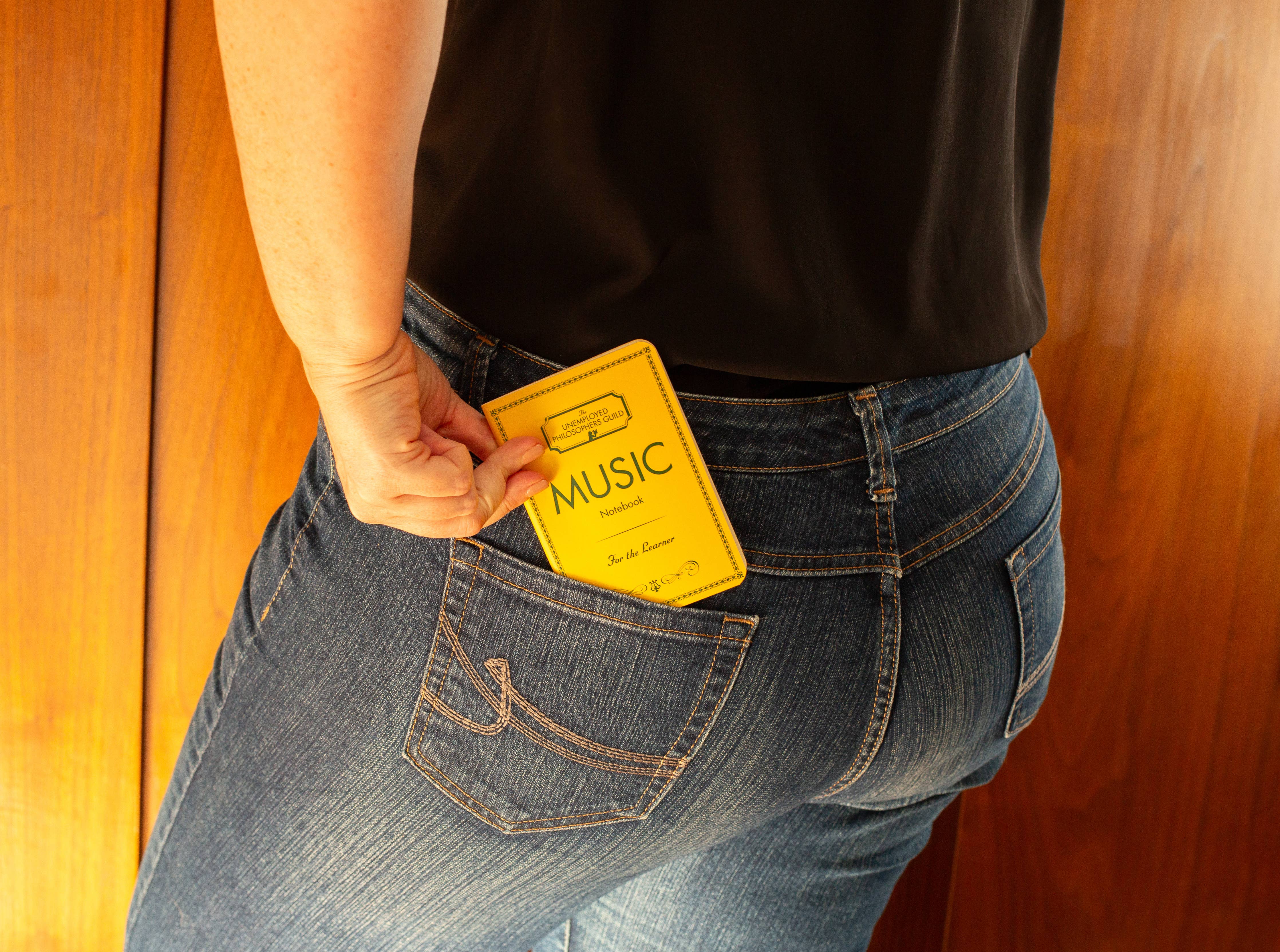 A yellow, pocket-sized Pocket Music Notebook with ornate borders by The Unemployed Philosophers Guild, featuring a music reference chart and the subtitle "For the Learner" in elegant script.